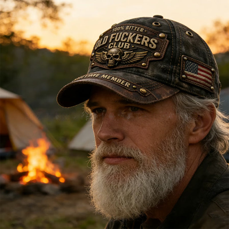 ODWAŻNY HAFT VINTAGE - Pochwal się swoim doświadczeniem dzięki naszywkom z tekstami „OLD FUCKERS CLUB”, „100% BITTER” i „LIFETIME MEMBER”. Ta czapka to odznaka honorowa, która celebruje dobrze przeżyte życie w bezkompromisowym, surowym stylu.