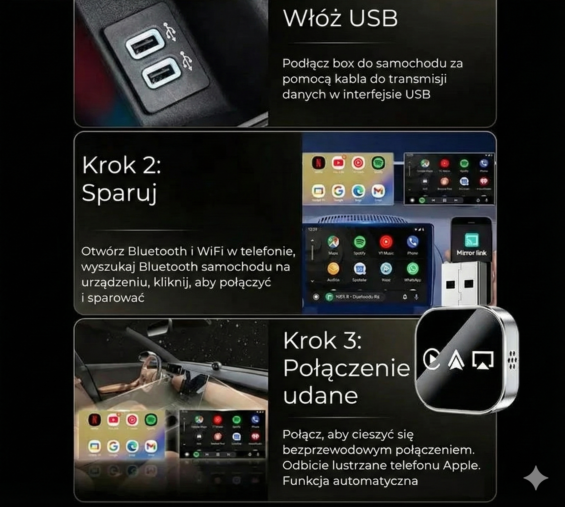 Instalacja to Plug-and-Play: wystarczy włożyć adapter do portu USB, sparować i gotowe. Adapter trzyma się mocno, zapewnia stabilne połączenie i nie nadpisuje ważnych ustawień Twojego samochodu. Został zaprojektowany do codziennego użytku i jest odporny na wibracje oraz zmiany temperatury w pojeździe.